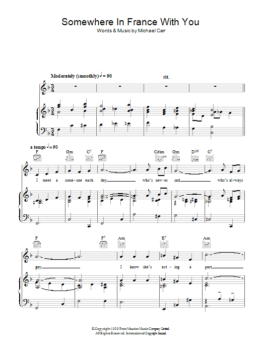 Download or print Michael Carr Somewhere In France With You sheet music, chords and digital score arranged for Piano, Vocal & Guitar Chords. This Traditional score includes 5 page(s).