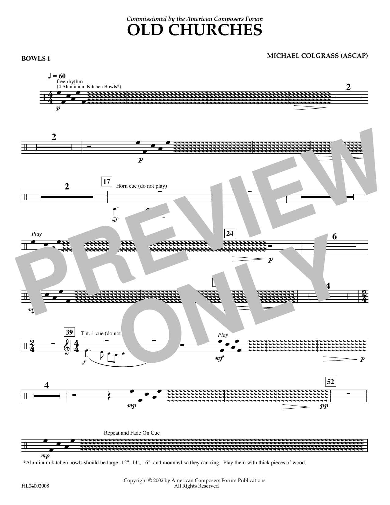 Download or print Michael Colgrass Old Churches - Aux. Percussion 1 sheet music, chords and digital score arranged for Concert Band. This Concert score includes 1 page(s).