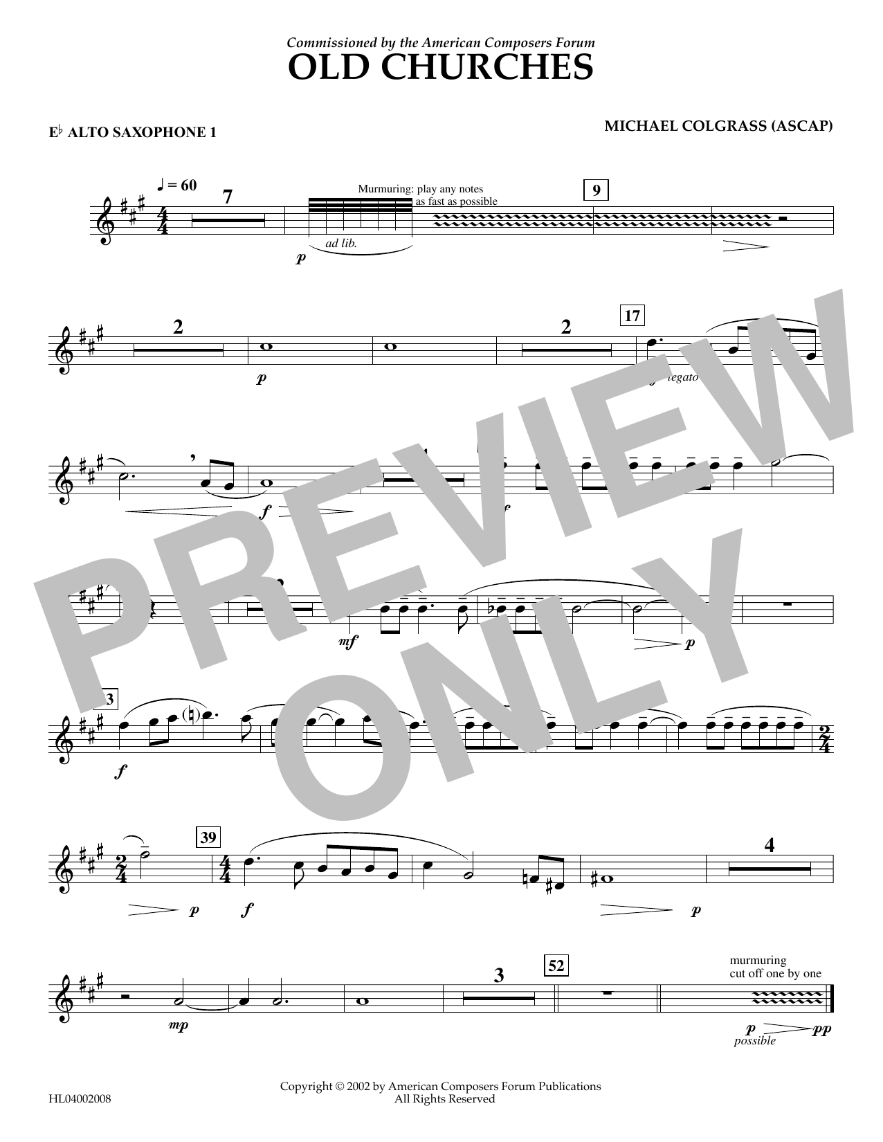 Download or print Michael Colgrass Old Churches - Eb Alto Saxophone 1 sheet music, chords and digital score arranged for Concert Band. This Concert score includes 1 page(s).