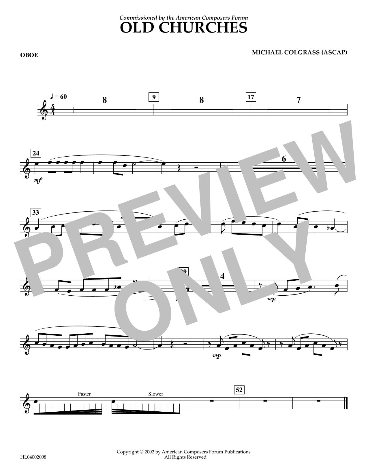Download or print Michael Colgrass Old Churches - Oboe sheet music, chords and digital score arranged for Concert Band. This Concert score includes 1 page(s).