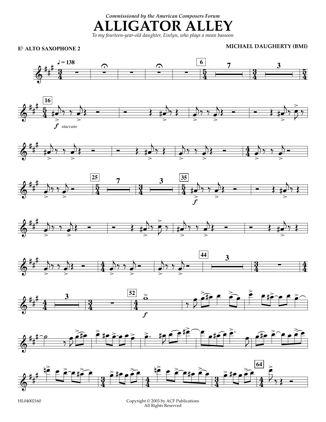 Michael Daugherty Alligator Alley - Eb Alto Sax 2 sheet music notes were arranged for Concert Band and include 3 page(s). The music style of the score is Concert. SKU (or the catalog) number of the music notation is 406009. The arrangement code for the composition is CB. Minimum required purchase quantity for these notes is 1.