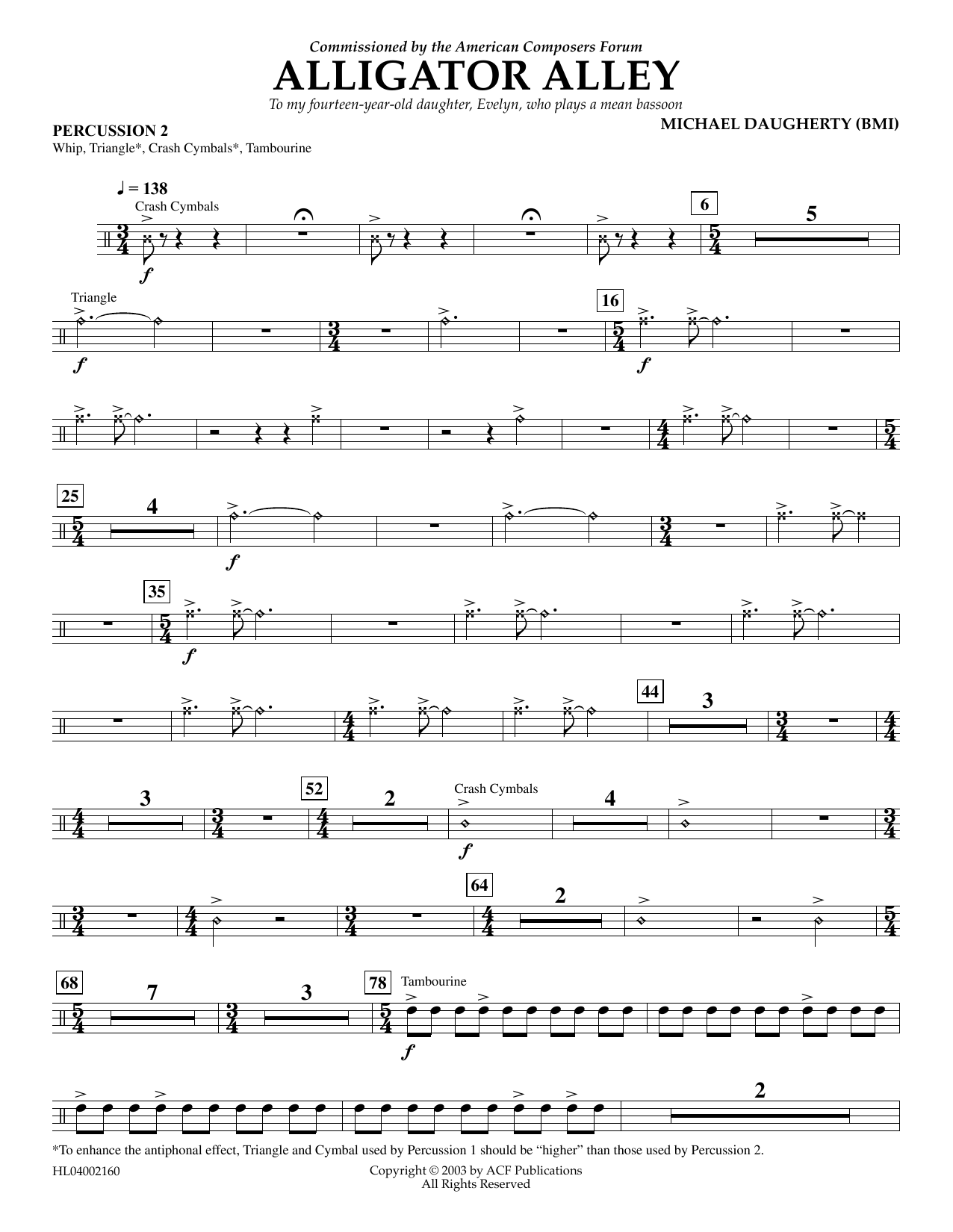 Michael Daugherty Alligator Alley - Percussion 2 sheet music notes were arranged for Concert Band and include 2 page(s). The music style of the score is Concert. SKU (or the catalog) number of the music notation is 406024. The arrangement code for the composition is CB. Minimum required purchase quantity for these notes is 1.