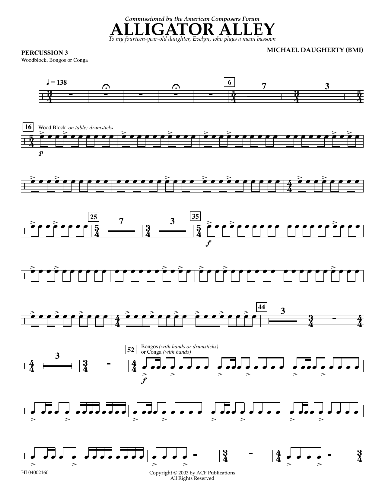 Michael Daugherty Alligator Alley - Percussion 3 sheet music notes were arranged for Concert Band and include 3 page(s). The music style of the score is Concert. SKU (or the catalog) number of the music notation is 406025. The arrangement code for the composition is CB. Minimum required purchase quantity for these notes is 1.