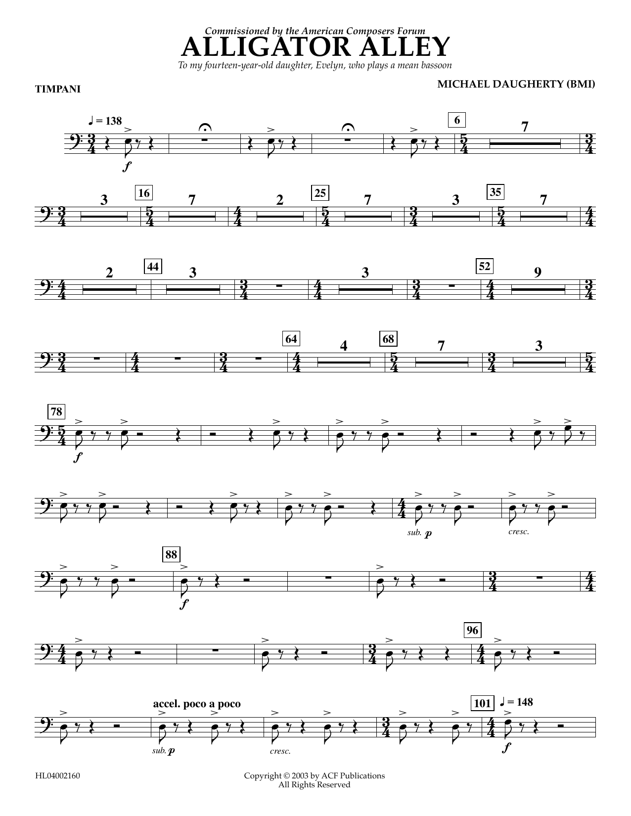 Michael Daugherty Alligator Alley - Timpani sheet music notes were arranged for Concert Band and include 2 page(s). The music style of the score is Concert. SKU (or the catalog) number of the music notation is 406022. The arrangement code for the composition is CB. Minimum required purchase quantity for these notes is 1.
