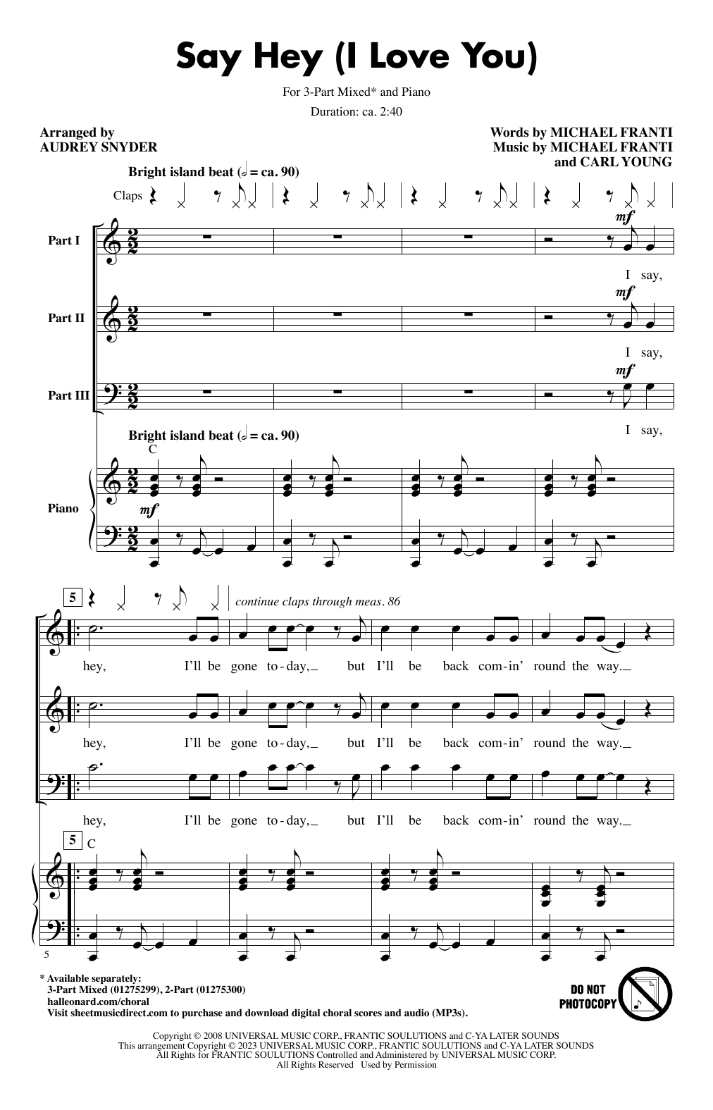 Download or print Michael Franti & Spearhead feat. Cherine Anderson Say Hey (I Love You) (arr. Audrey Snyder) sheet music, chords and digital score arranged for 3-Part Mixed Choir. This Pop score includes 14 page(s).