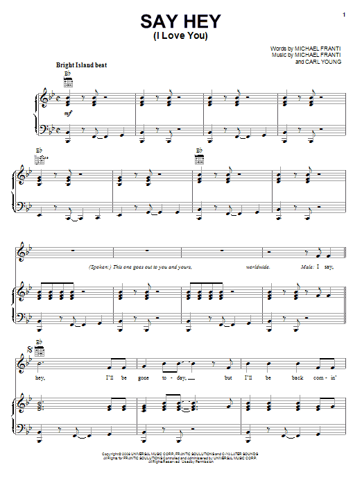 Download or print Michael Franti & Spearhead Say Hey (I Love You) sheet music, chords and digital score arranged for Piano, Vocal & Guitar Chords (Right-Hand Melody). This Pop score includes 9 page(s).