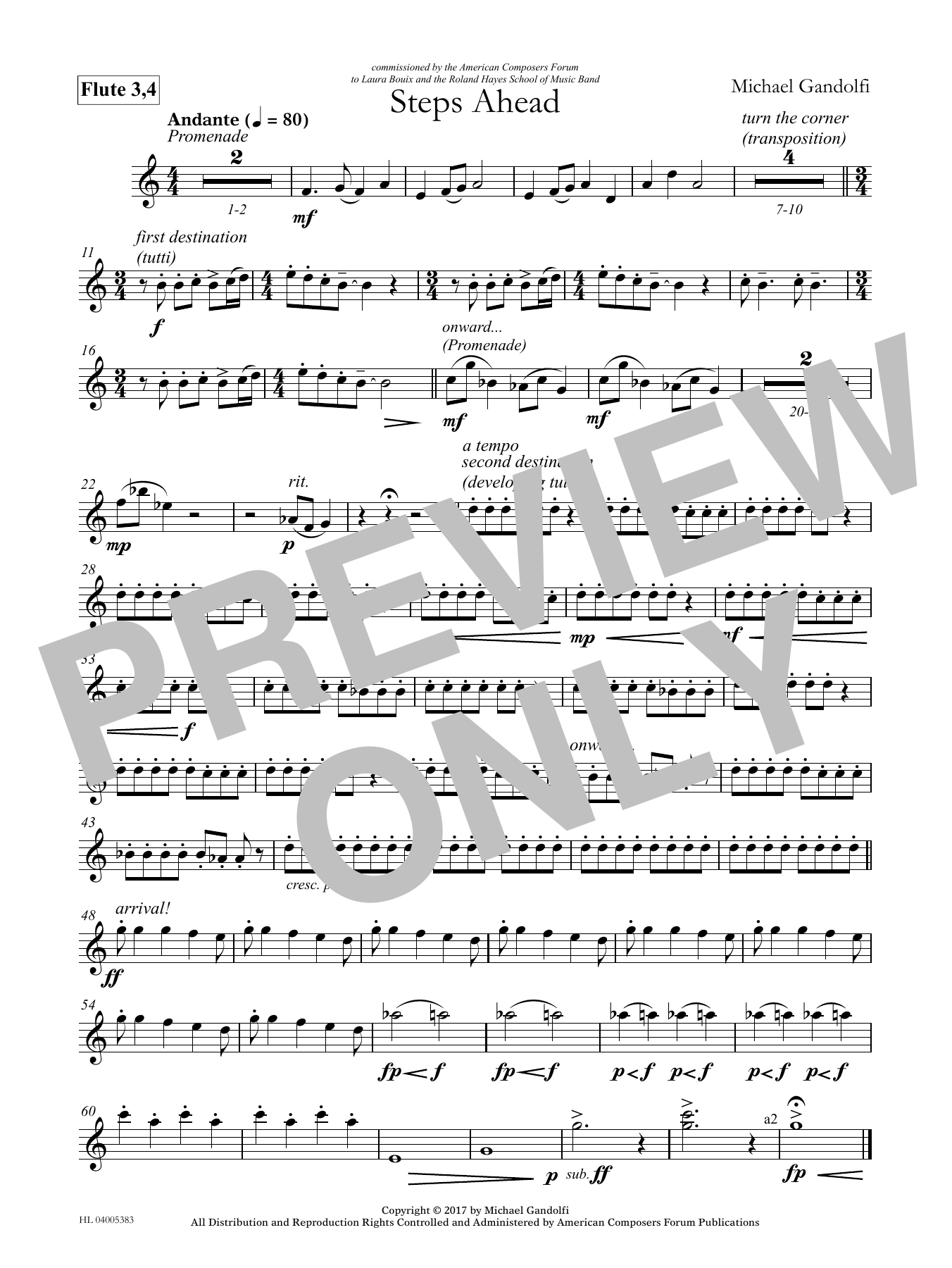 Download or print Michael Gandolfi Steps Ahead - Flute 3 & 4 sheet music, chords and digital score arranged for Concert Band. This Concert score includes 1 page(s).