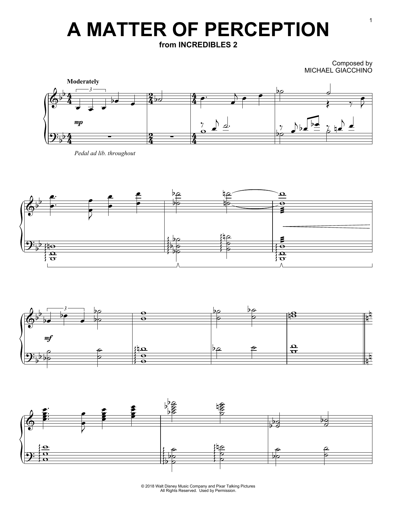 Download or print Michael Giacchino A Matter Of Perception (from Incredibles 2) sheet music, chords and digital score arranged for Piano Solo. This Children score includes 2 page(s).