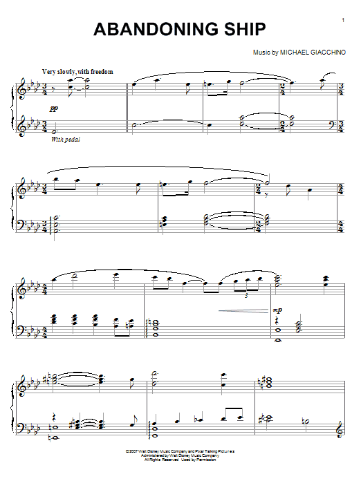 Download or print Michael Giacchino Abandoning Ship sheet music, chords and digital score arranged for Piano Solo. This Children score includes 3 page(s).