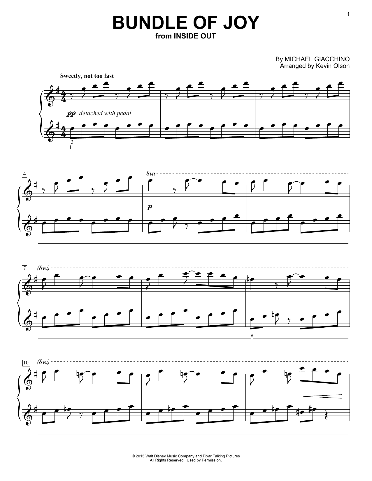Download or print Michael Giacchino Bundle Of Joy (from Inside Out) (arr. Kevin Olson) sheet music, chords and digital score arranged for Easy Piano Solo. This Disney score includes 4 page(s).