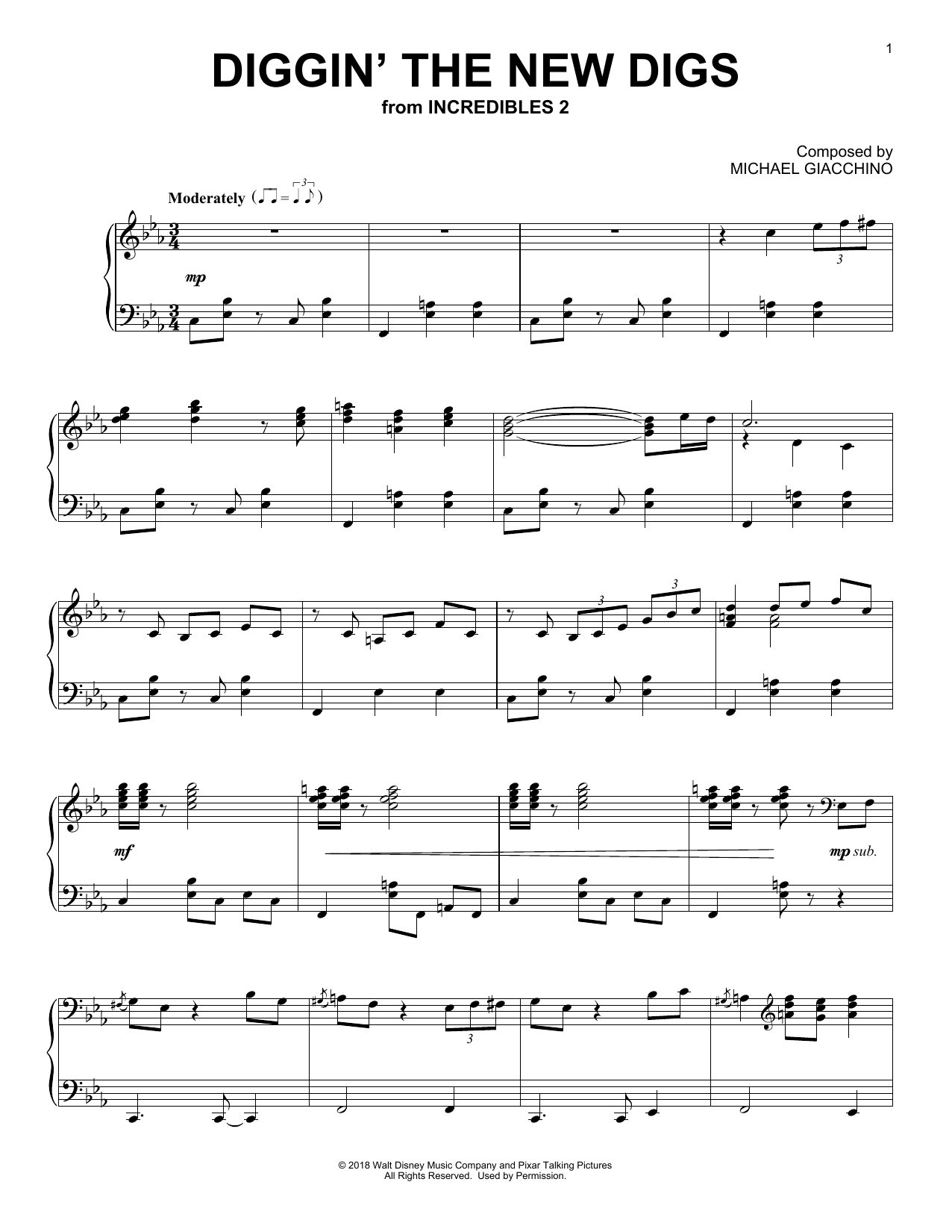 Download or print Michael Giacchino Diggin' The New Digs (from Incredibles 2) sheet music, chords and digital score arranged for Piano Solo. This Children score includes 3 page(s).