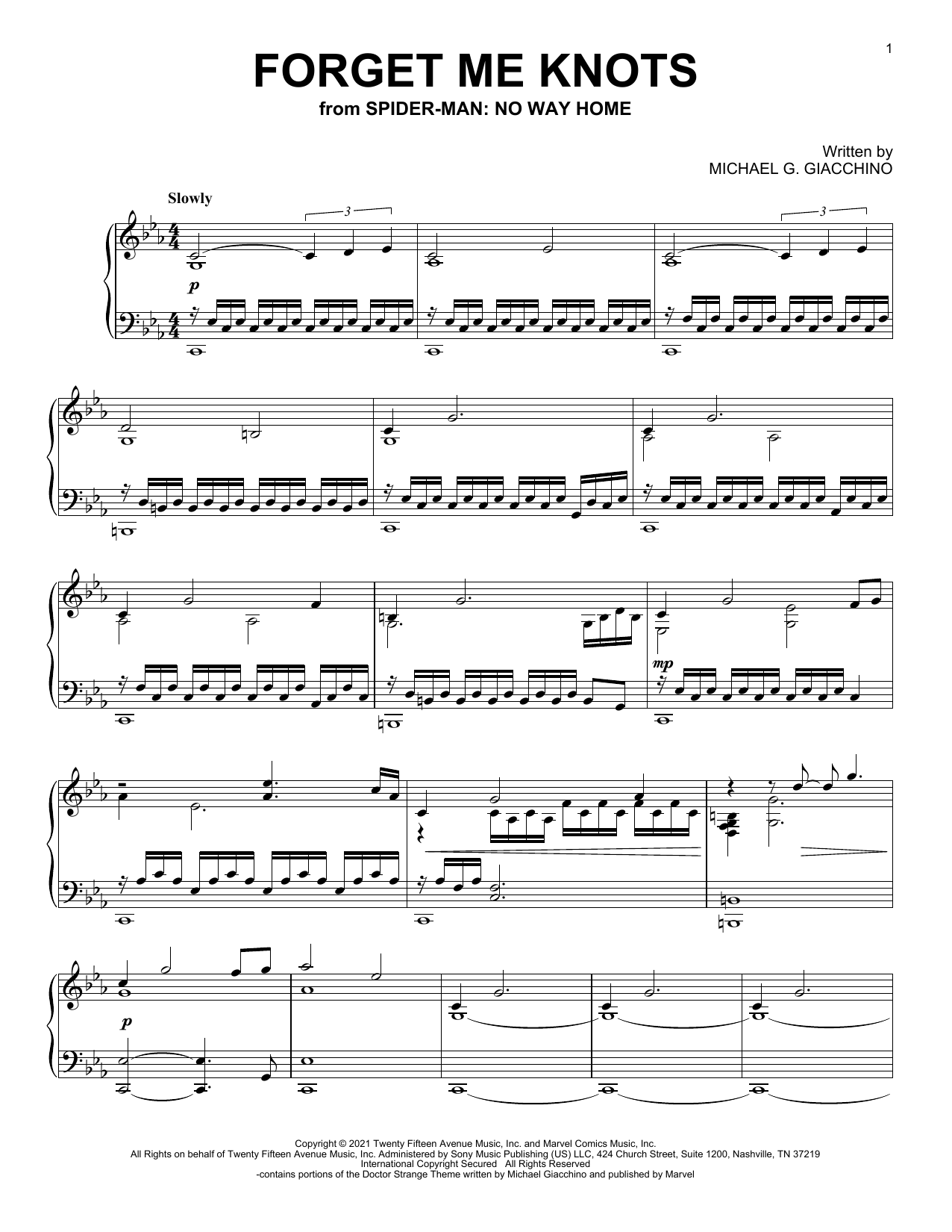 Download or print Michael Giacchino Forget Me Knots (from Spider-Man: No Way Home) sheet music, chords and digital score arranged for Piano Solo. This Film/TV score includes 3 page(s).