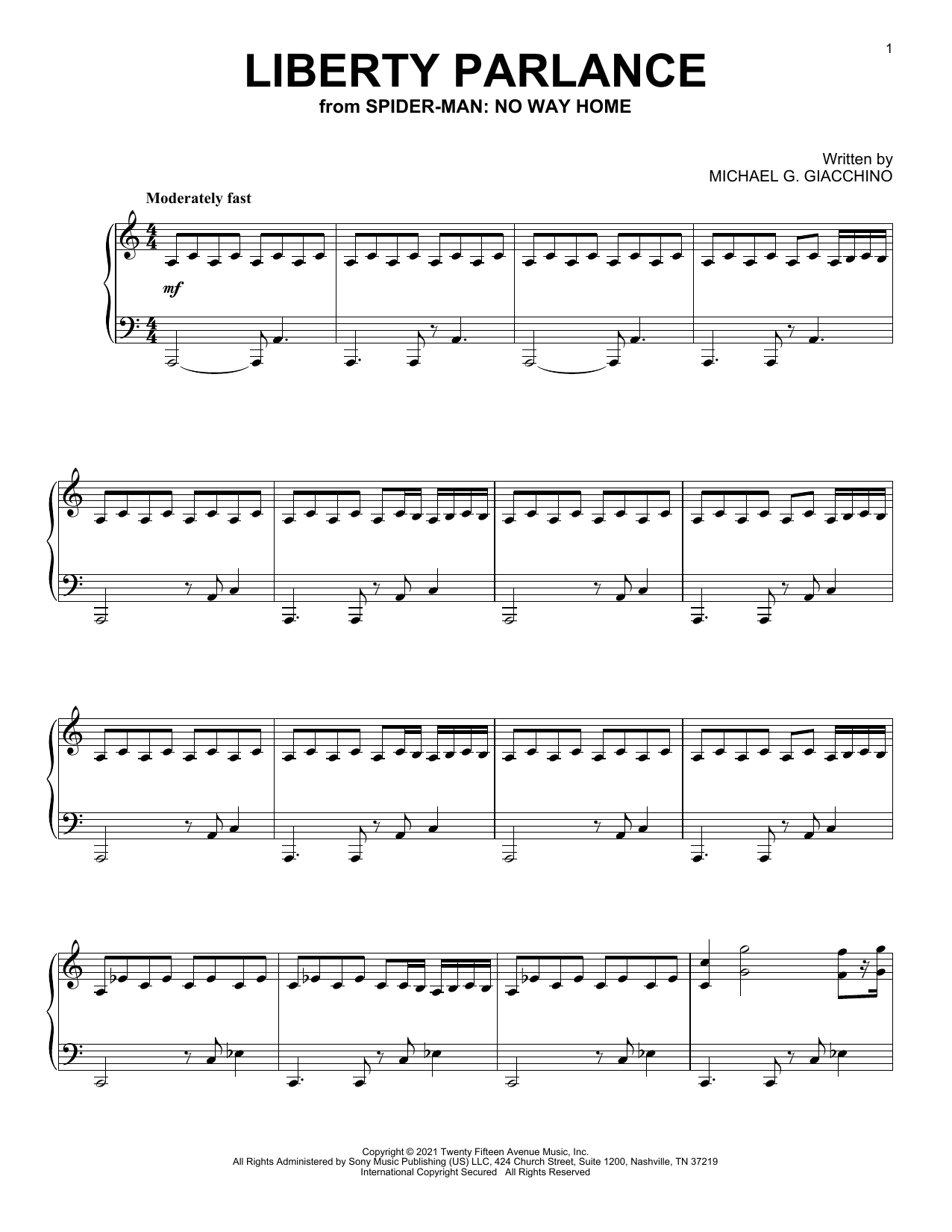 Download or print Michael Giacchino Liberty Parlance (from Spider-Man: No Way Home) sheet music, chords and digital score arranged for Piano Solo. This Film/TV score includes 3 page(s).
