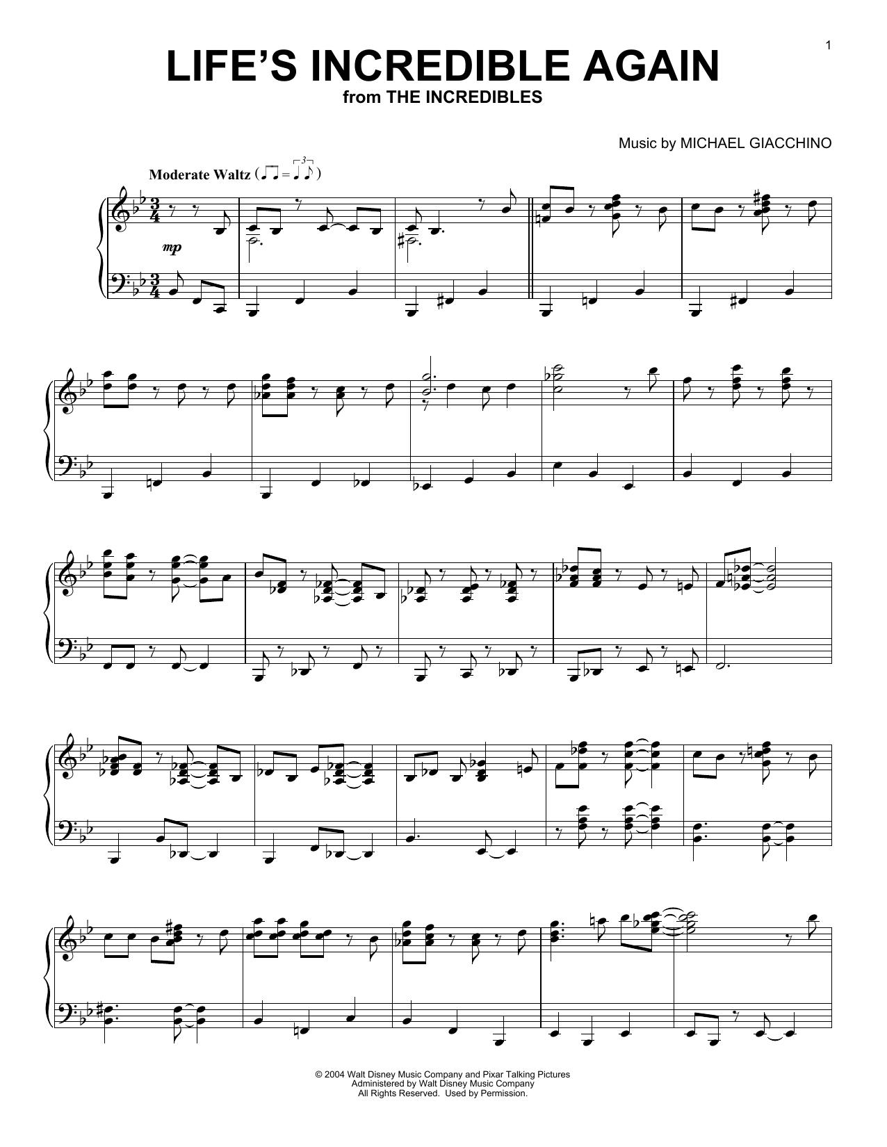 Download or print Michael Giacchino Life's Incredible Again sheet music, chords and digital score arranged for Piano Solo. This Children score includes 2 page(s).
