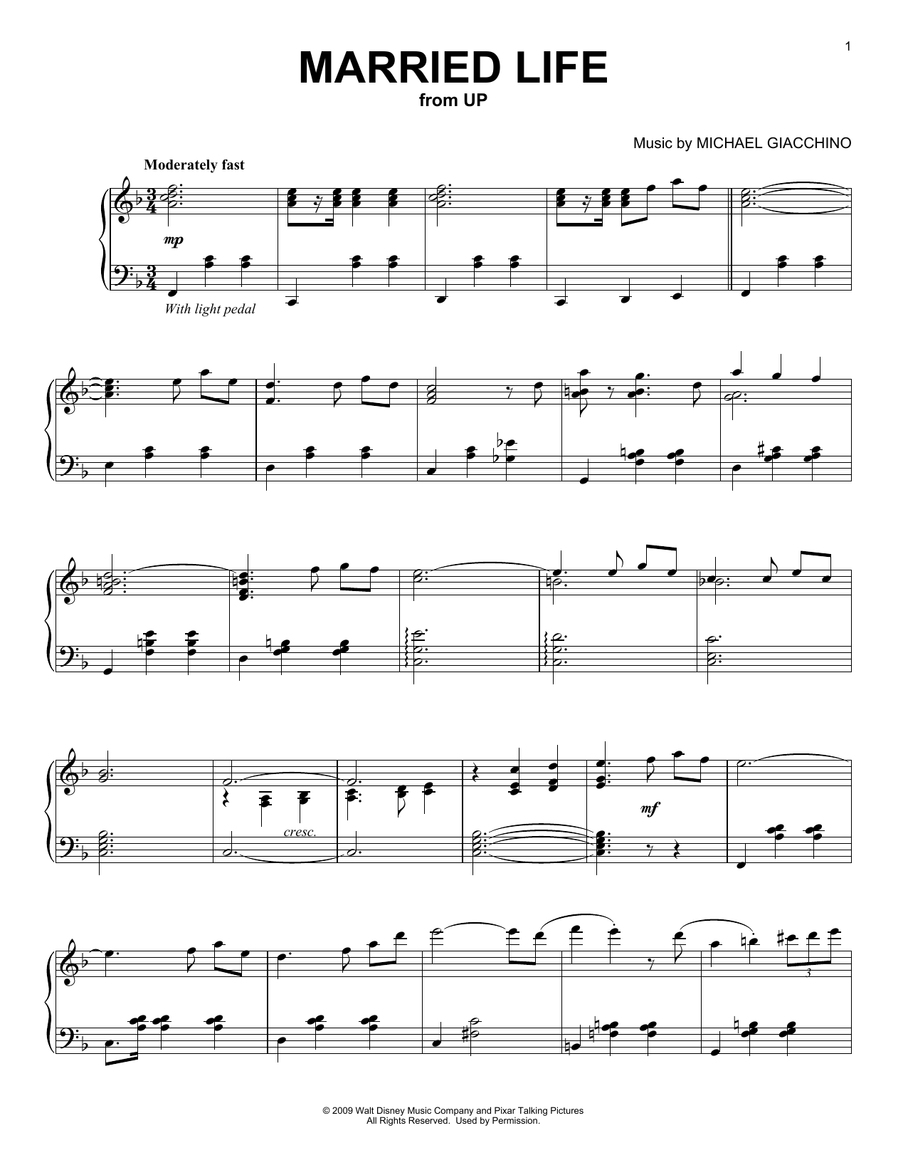 Download or print Michael Giacchino Married Life (from Up) sheet music, chords and digital score arranged for Very Easy Piano. This Disney score includes 4 page(s).