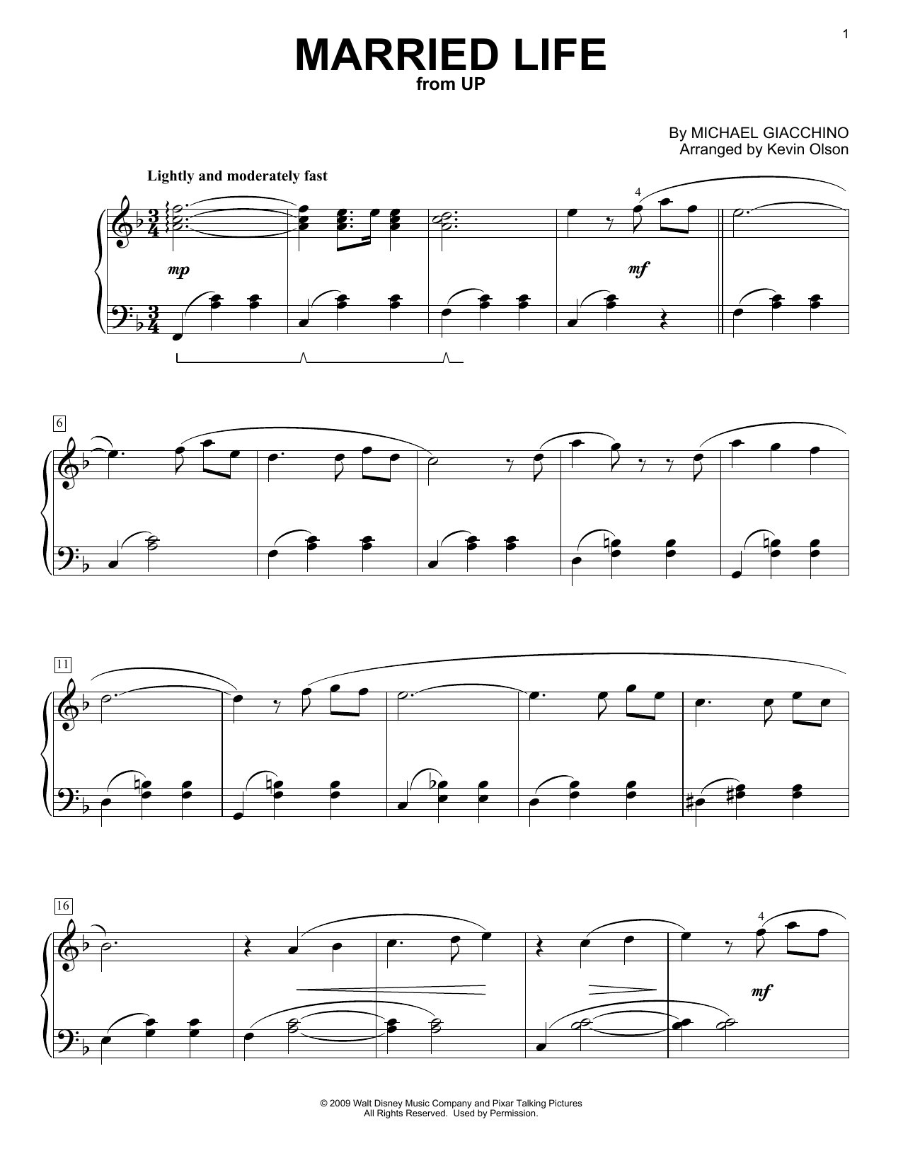 Download or print Michael Giacchino Married Life (from Up) (arr. Kevin Olson) sheet music, chords and digital score arranged for Easy Piano Solo. This Disney score includes 3 page(s).