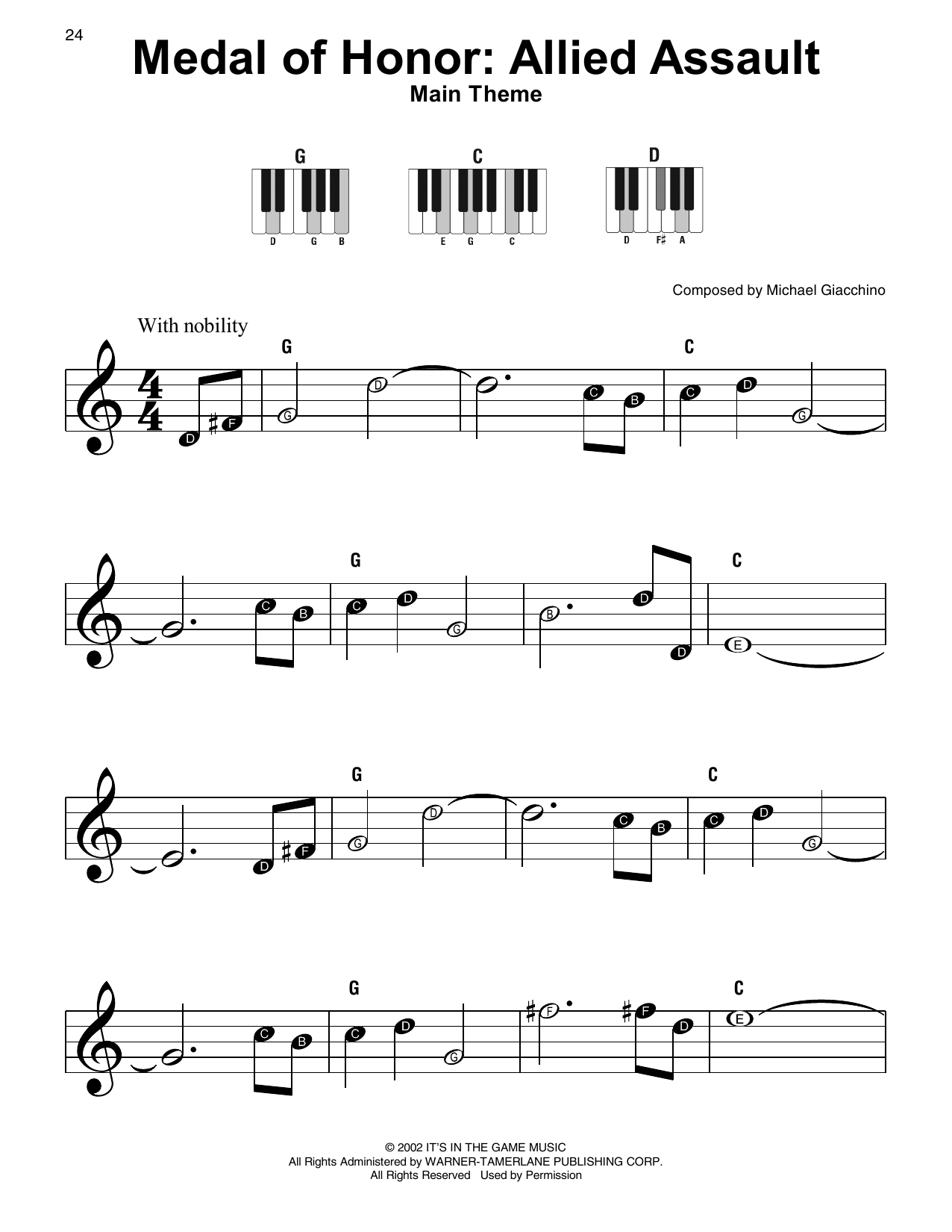 Download or print Michael Giacchino Medal Of Honor: Allied Assault (Main Theme) sheet music, chords and digital score arranged for Easy Piano Solo. This Video Game score includes 3 page(s).