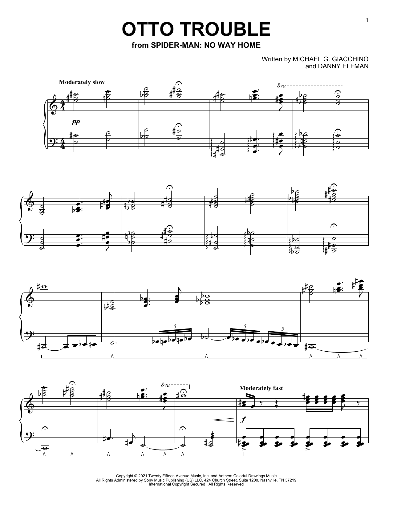 Download or print Michael Giacchino Otto Trouble (from Spider-Man: No Way Home) sheet music, chords and digital score arranged for Piano Solo. This Film/TV score includes 5 page(s).