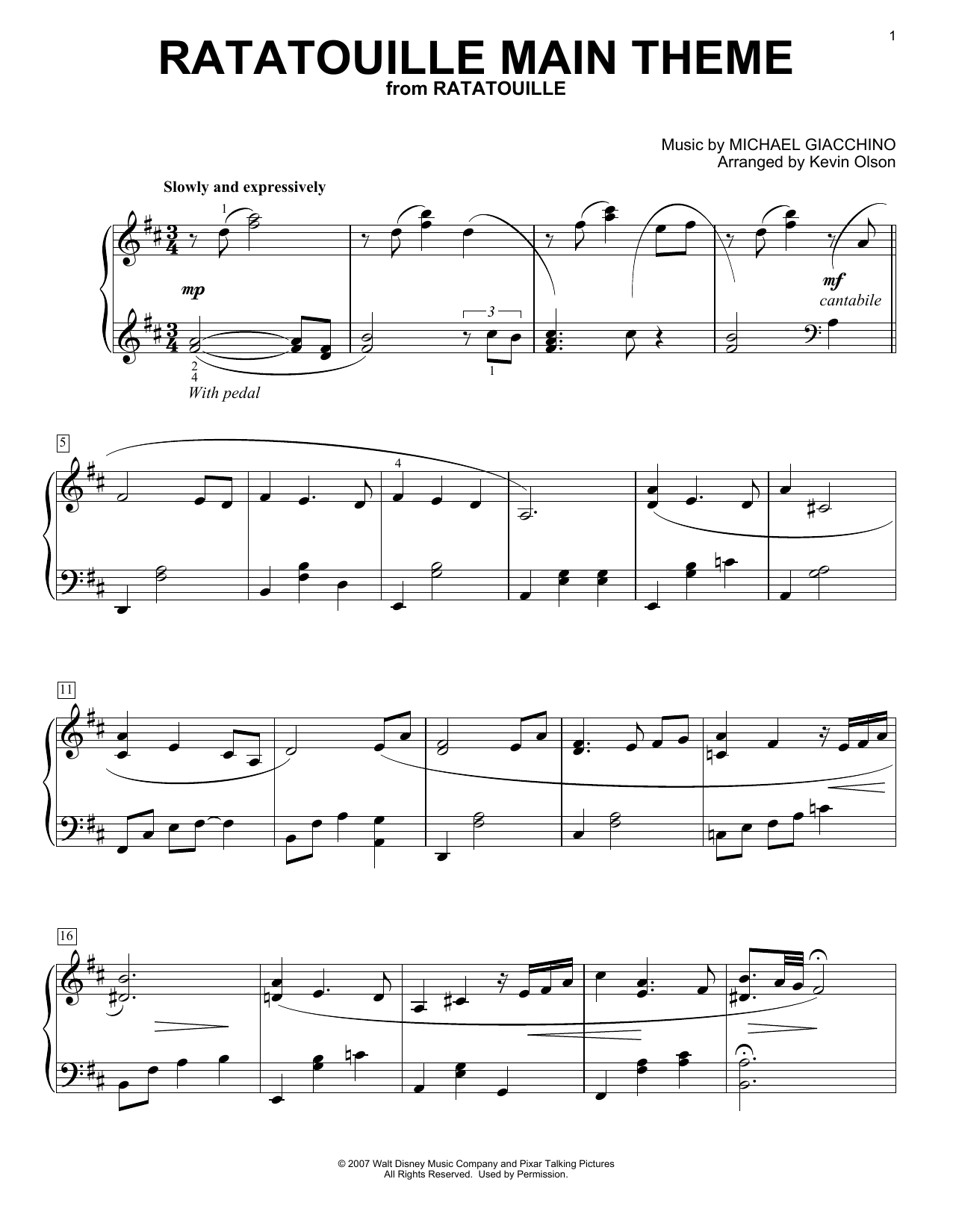 Download or print Michael Giacchino Ratatouille (Main Theme) (arr. Kevin Olson) sheet music, chords and digital score arranged for Easy Piano Solo. This Disney score includes 2 page(s).