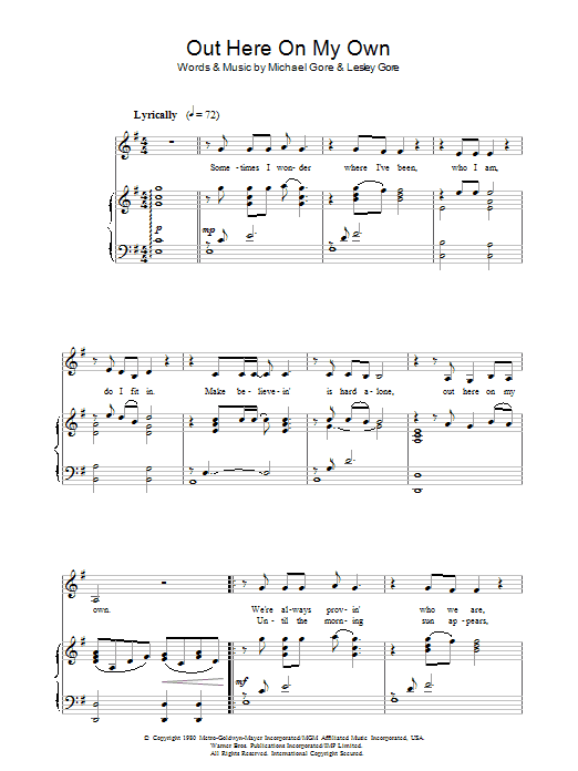 Download or print Michael Gore Out Here On My Own (from Fame) sheet music, chords and digital score arranged for Piano & Vocal. This Pop score includes 3 page(s).