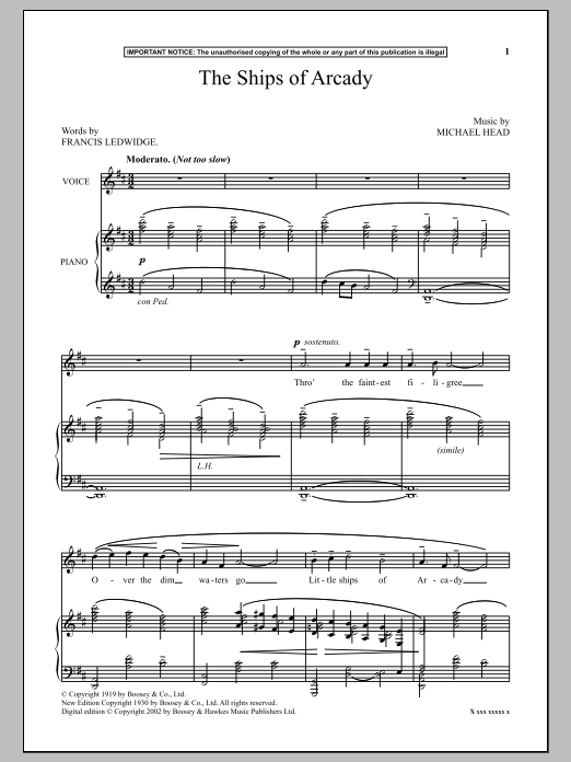 Download or print Michael Head The Ships Of Arcady sheet music, chords and digital score arranged for Piano & Vocal. This Classical score includes 5 page(s).
