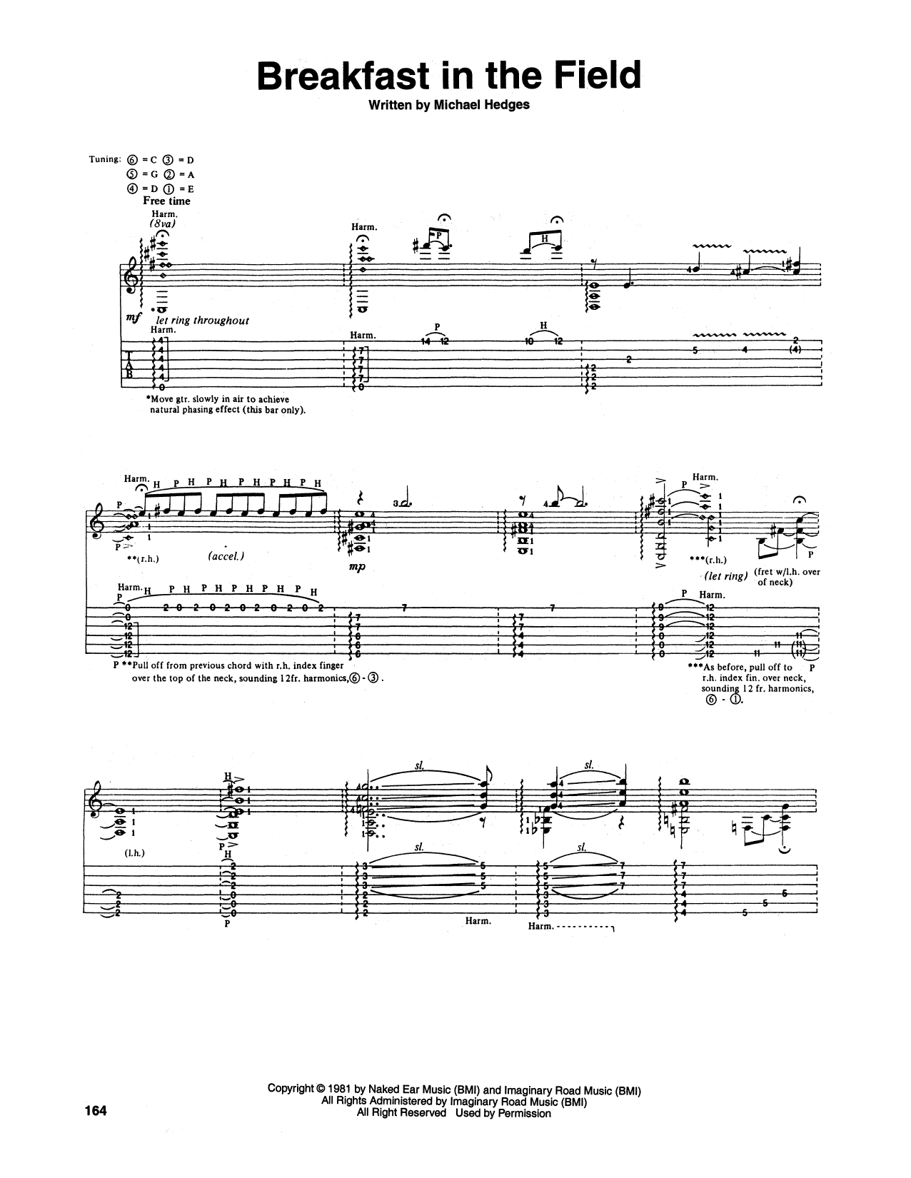Download or print Michael Hedges Breakfast In The Field sheet music, chords and digital score arranged for Guitar Tab. This Pop score includes 2 page(s).