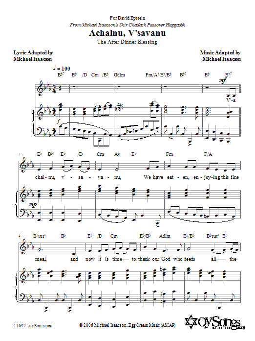 Download or print Michael Isaacson Achalnu V'savanu sheet music, chords and digital score arranged for Piano, Vocal & Guitar Chords (Right-Hand Melody). This Traditional score includes 2 page(s).