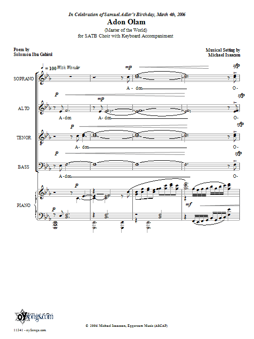 Download or print Michael Isaacson Adon Olam sheet music, chords and digital score arranged for SATB Choir. This Traditional score includes 11 page(s).