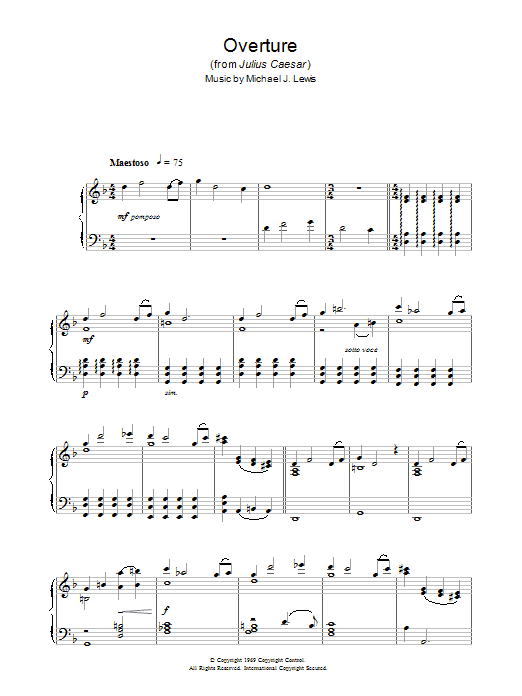 Download or print Michael J. Lewis Overture (from Julius Caesar) sheet music, chords and digital score arranged for Piano Solo. This Film/TV score includes 2 page(s).