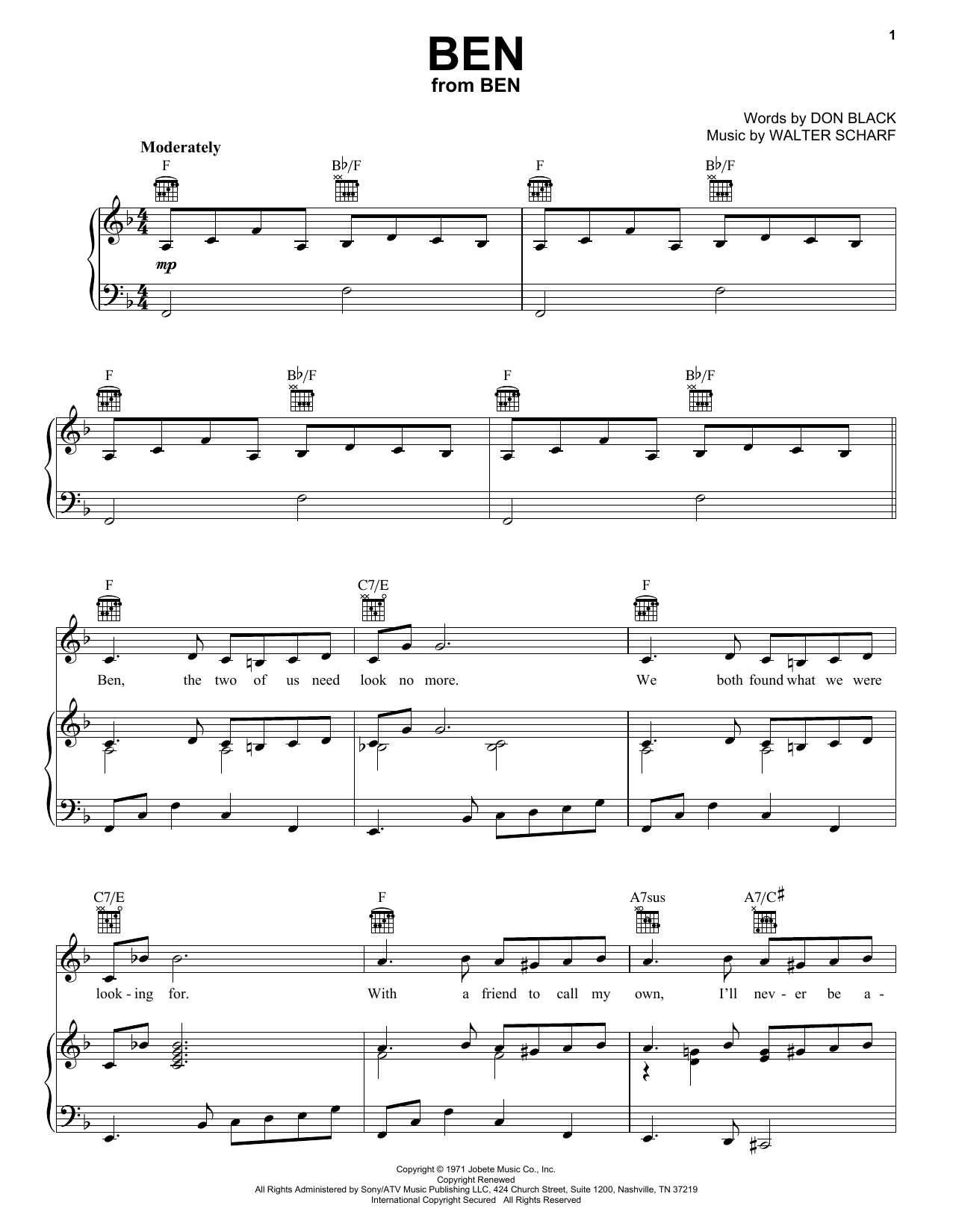 Download or print Michael Jackson Ben sheet music, chords and digital score arranged for Piano Chords/Lyrics. This Pop score includes 2 page(s).
