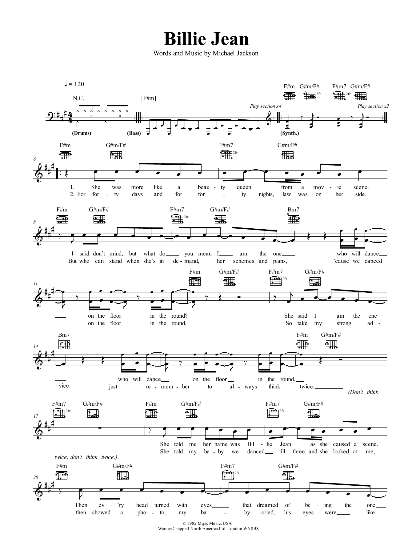 Download or print Michael Jackson Billie Jean sheet music, chords and digital score arranged for Piano, Vocal & Guitar Chords (Right-Hand Melody). This Pop score includes 8 page(s).