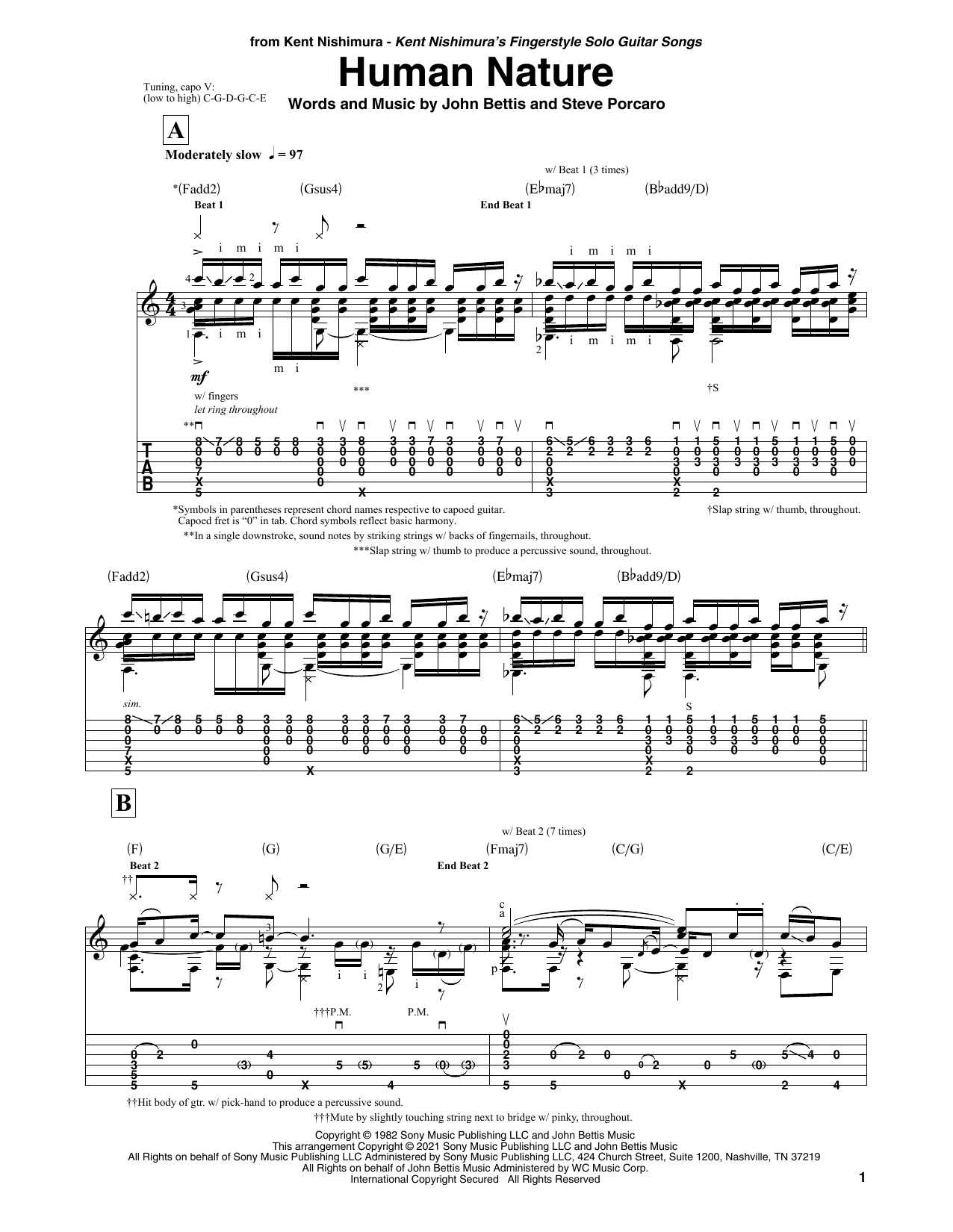 Download or print Michael Jackson Human Nature (arr. Kent Nishimura) sheet music, chords and digital score arranged for Solo Guitar. This Pop score includes 9 page(s).