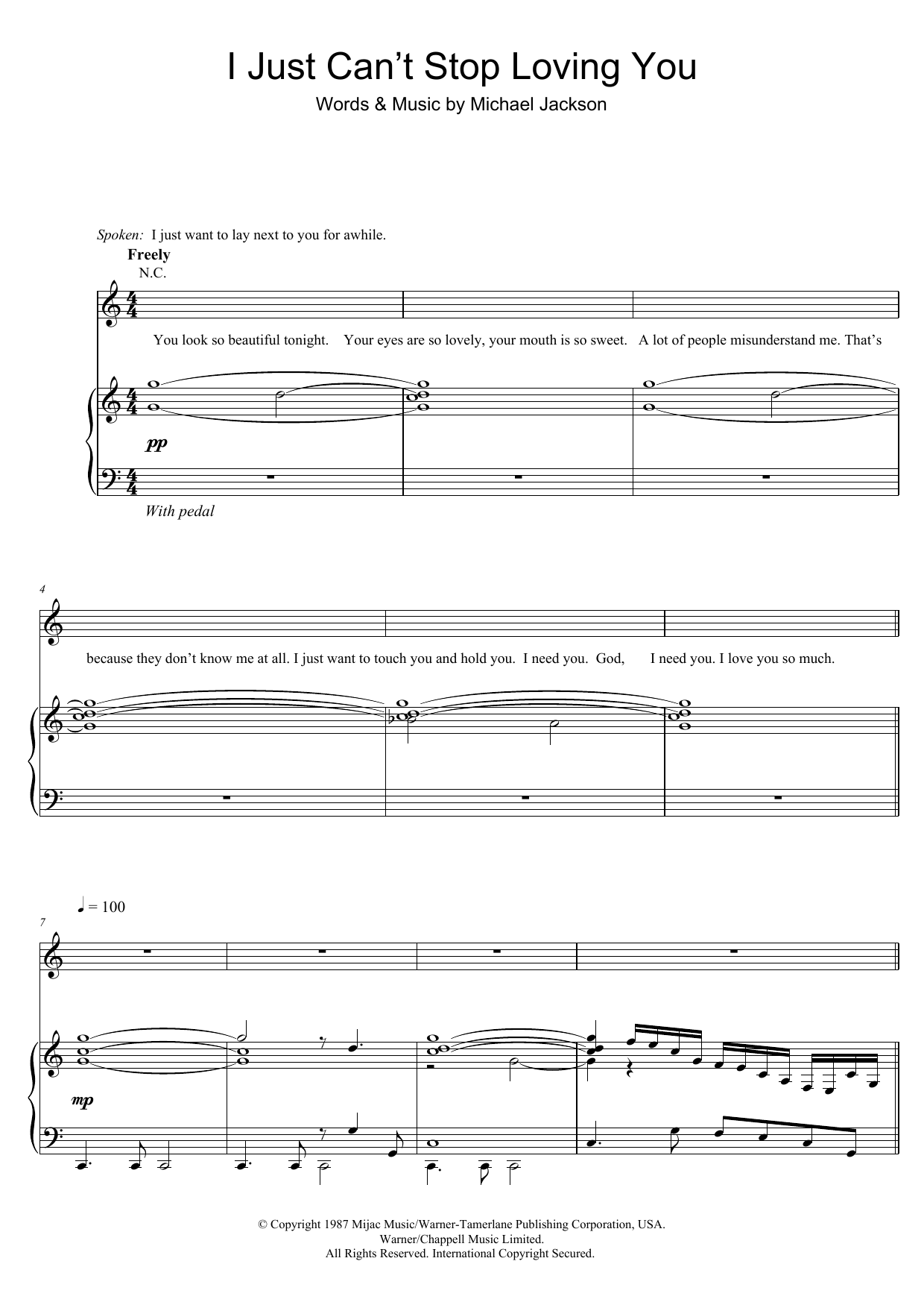 Download or print Michael Jackson I Just Can't Stop Loving You sheet music, chords and digital score arranged for Easy Piano. This Pop score includes 4 page(s).