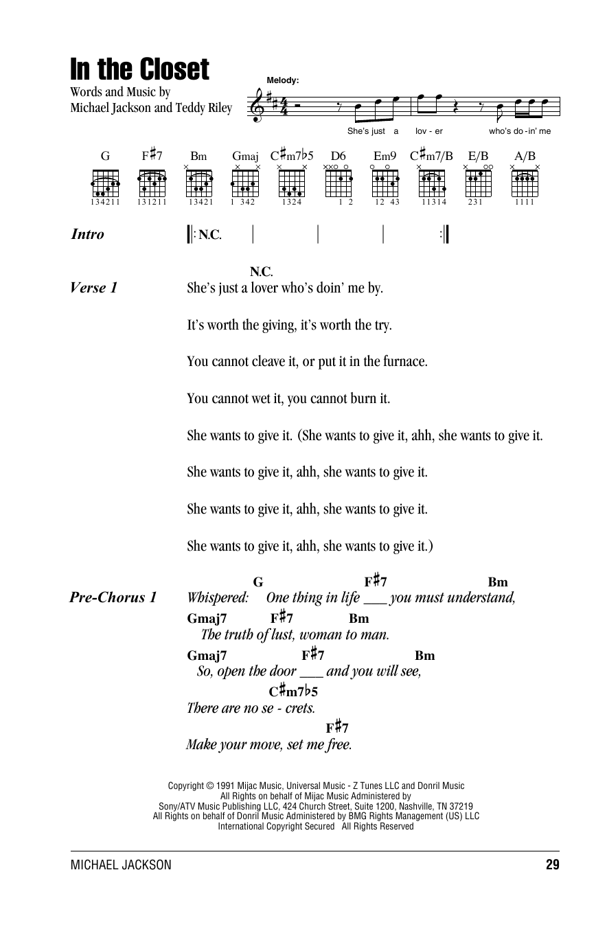 Download or print Michael Jackson In The Closet sheet music, chords and digital score arranged for Guitar Chords/Lyrics. This Pop score includes 3 page(s).