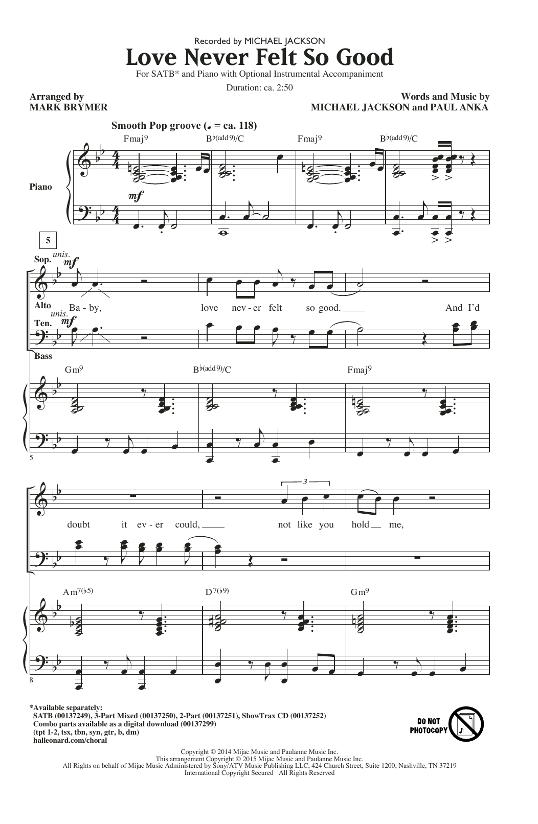 Download or print Mark Brymer Love Never Felt So Good sheet music, chords and digital score arranged for 3-Part Mixed Choir. This Pop score includes 11 page(s).