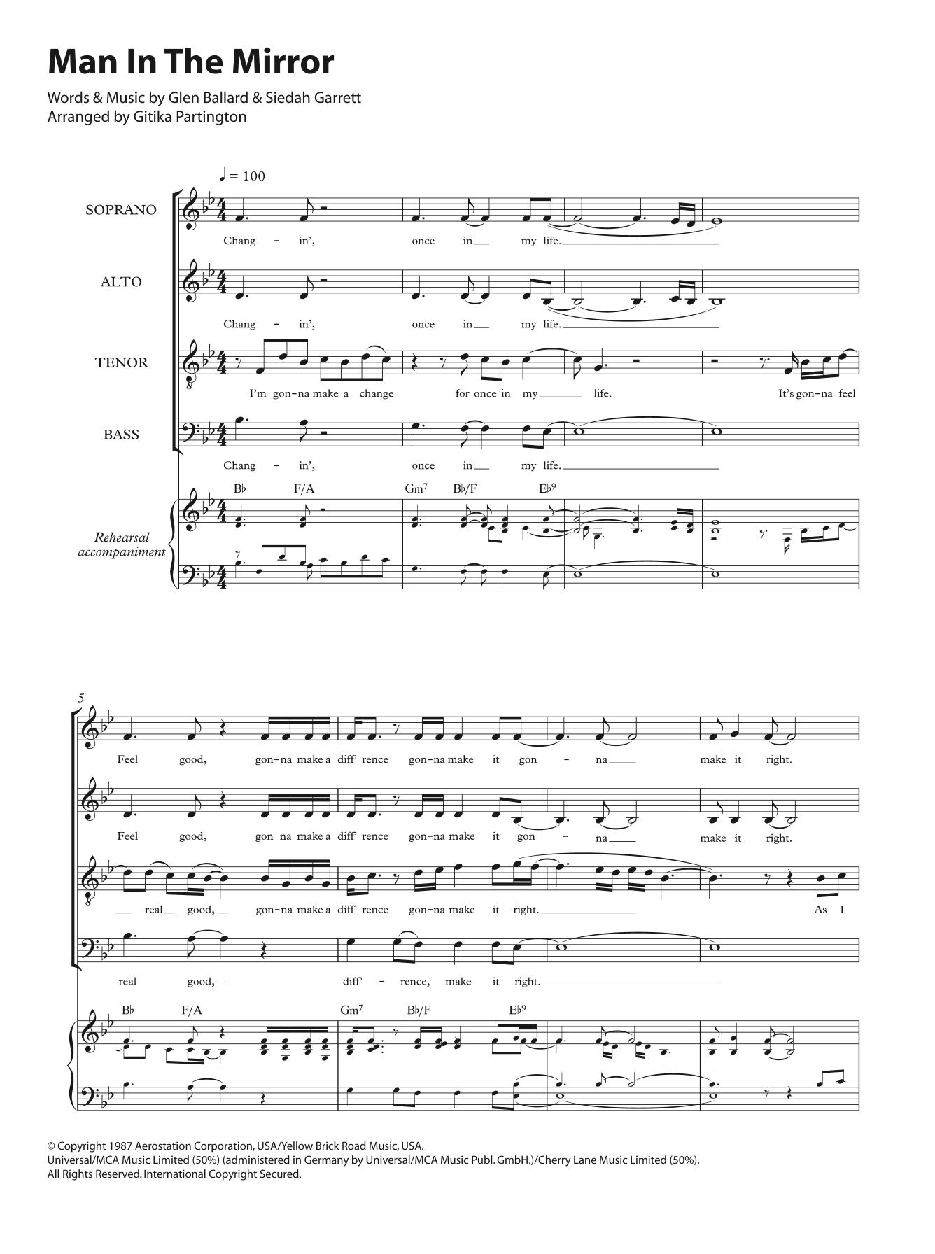 Download or print Michael Jackson Man In The Mirror (arr. Gitika Partington) sheet music, chords and digital score arranged for SATB Choir. This Pop score includes 11 page(s).
