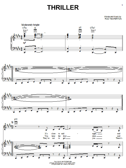Download or print Michael Jackson Thriller sheet music, chords and digital score arranged for Guitar Chords/Lyrics. This Pop score includes 4 page(s).