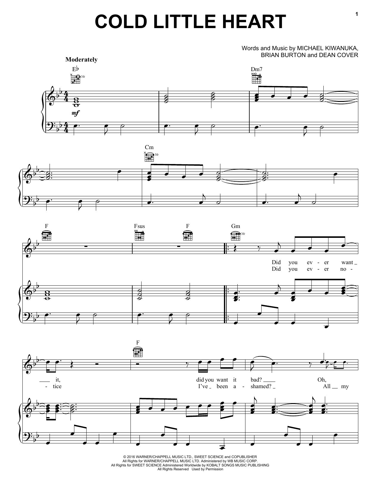 Download or print Michael Kiwanuka Cold Little Heart (theme from Big Little Lies) sheet music, chords and digital score arranged for Piano, Vocal & Guitar Chords (Right-Hand Melody). This Pop score includes 5 page(s).