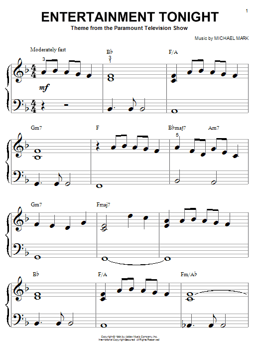 Download or print Michael Mark Entertainment Tonight sheet music, chords and digital score arranged for Big Note Piano. This Film/TV score includes 4 page(s).