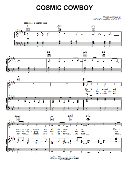 Download or print Michael Martin Murphey Cosmic Cowboy sheet music, chords and digital score arranged for Piano, Vocal & Guitar Chords (Right-Hand Melody). This Country score includes 5 page(s).