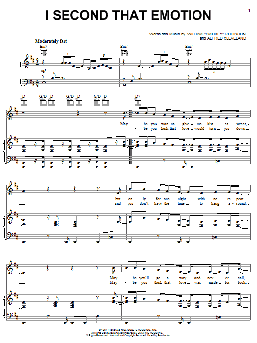 Download or print Michael McDonald I Second That Emotion sheet music, chords and digital score arranged for Piano, Vocal & Guitar Chords (Right-Hand Melody). This Oldies score includes 4 page(s).