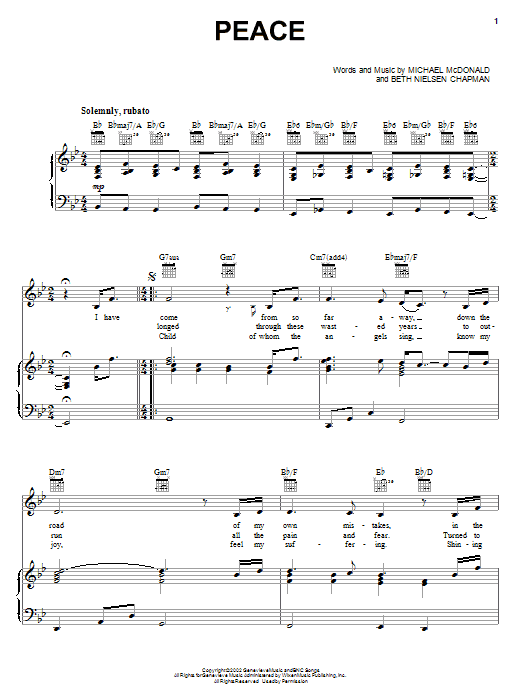 Download or print Michael McDonald Peace sheet music, chords and digital score arranged for Piano, Vocal & Guitar Chords (Right-Hand Melody). This Christmas score includes 4 page(s).