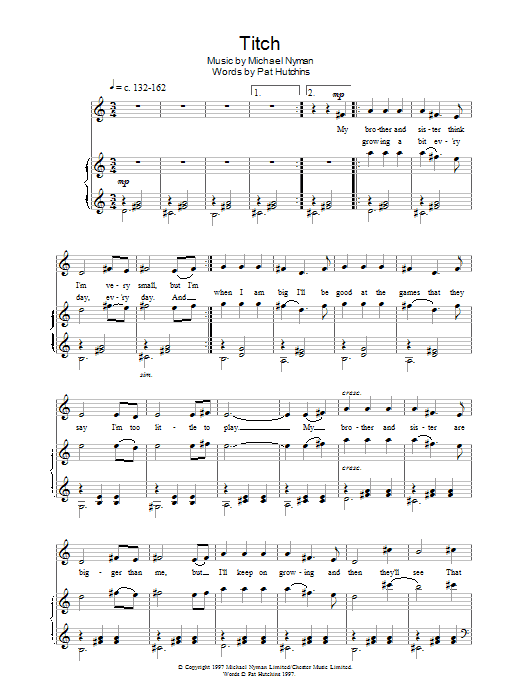 Download or print Michael Nyman Titch sheet music, chords and digital score arranged for Piano, Vocal & Guitar Chords. This Children score includes 3 page(s).