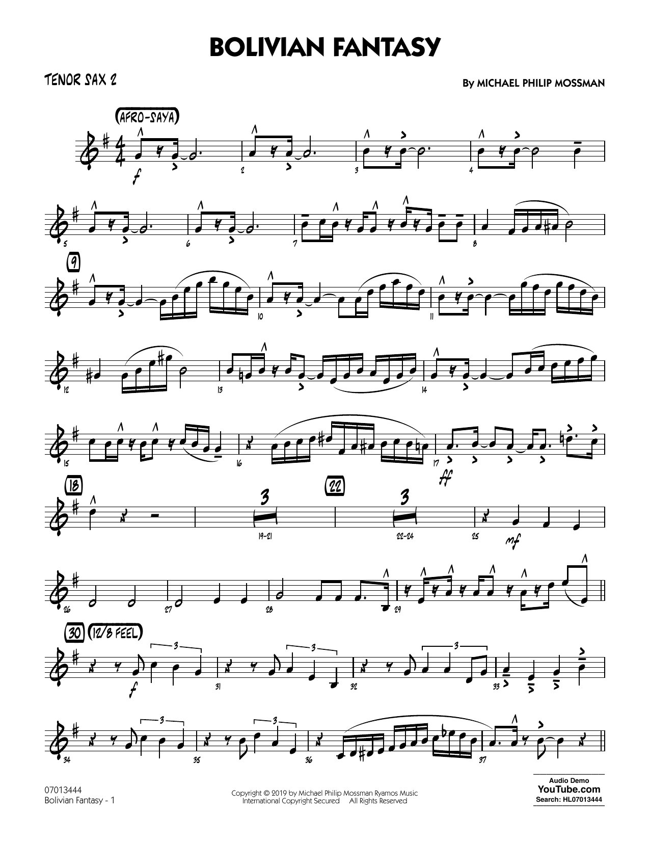 Download or print Michael Philip Mossman Bolivian Fantasy - Tenor Sax 2 sheet music, chords and digital score arranged for Jazz Ensemble. This Jazz score includes 3 page(s).