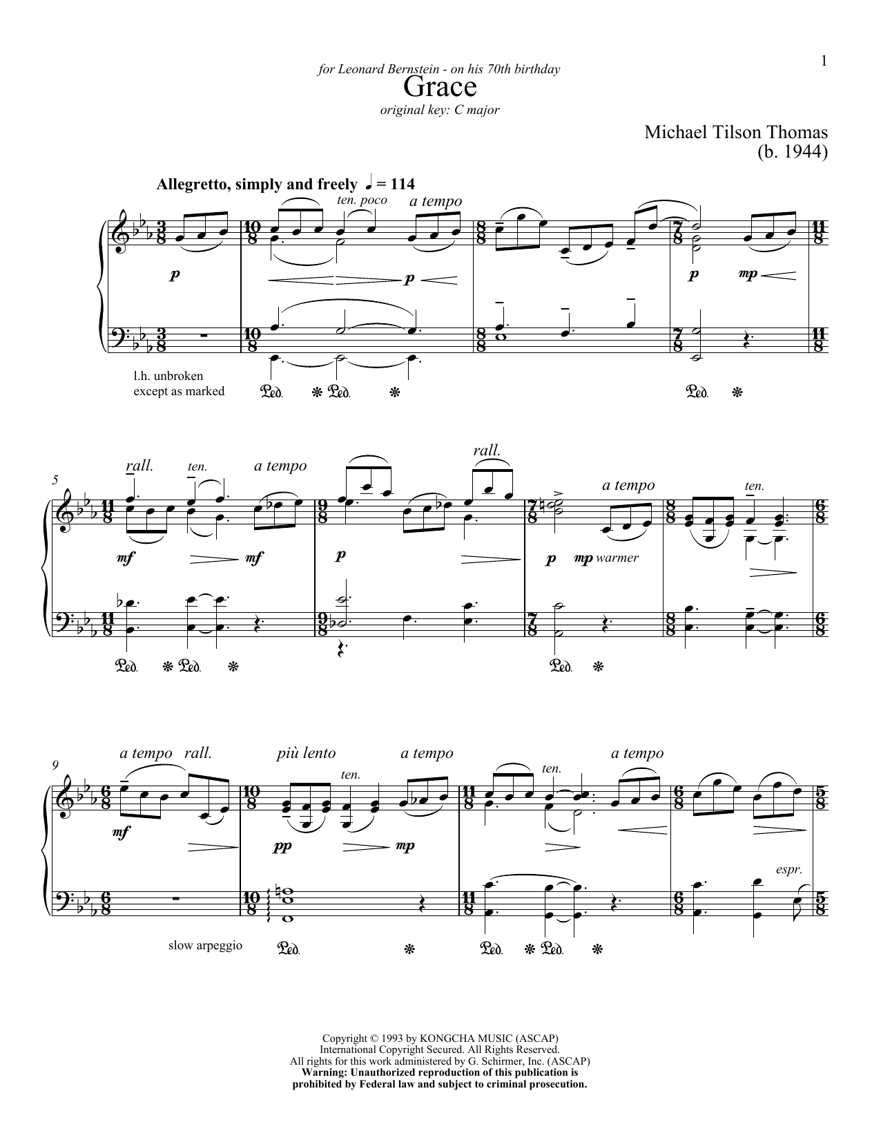 Download or print Michael Tilson Thomas Grace sheet music, chords and digital score arranged for Piano & Vocal. This Classical score includes 10 page(s).