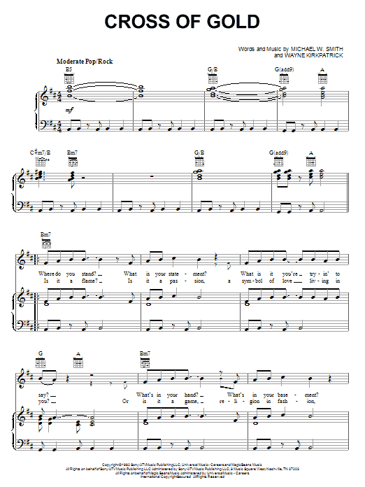 Download or print Michael W. Smith Cross Of Gold sheet music, chords and digital score arranged for Piano, Vocal & Guitar Chords (Right-Hand Melody). This Christian score includes 5 page(s).