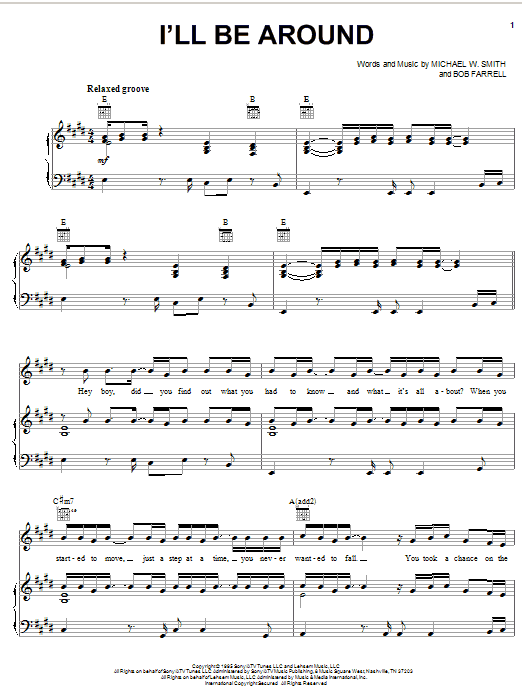 Download or print Michael W. Smith I'll Be Around sheet music, chords and digital score arranged for Piano, Vocal & Guitar Chords (Right-Hand Melody). This Christian score includes 7 page(s).