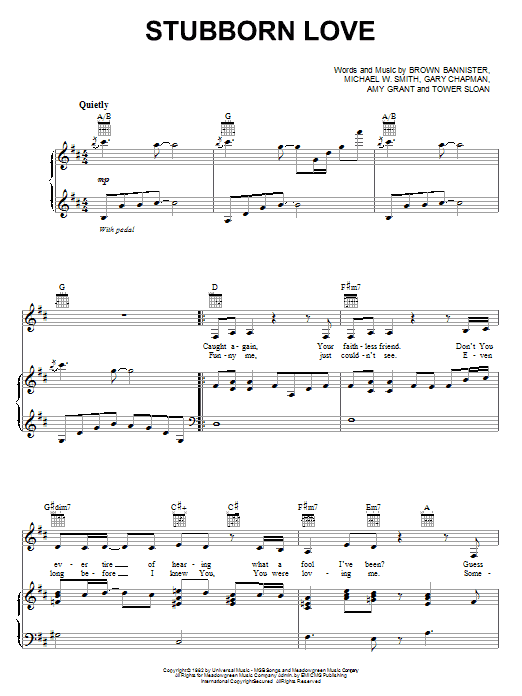 Download or print Michael W. Smith Stubborn Love sheet music, chords and digital score arranged for Piano, Vocal & Guitar Chords (Right-Hand Melody). This Christian score includes 3 page(s).