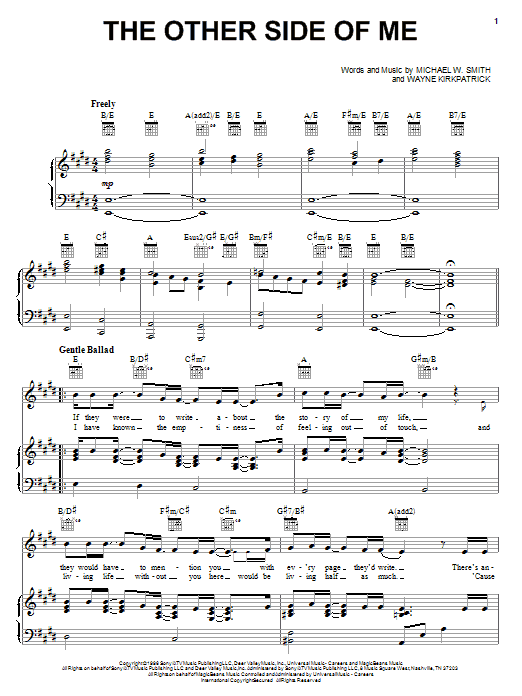 Download or print Michael W. Smith The Other Side Of Me sheet music, chords and digital score arranged for Piano, Vocal & Guitar Chords (Right-Hand Melody). This Christian score includes 4 page(s).