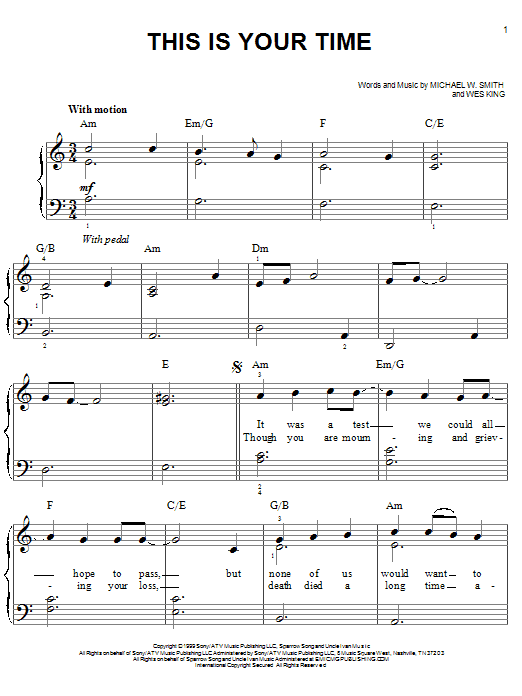 Download or print Michael W. Smith This Is Your Time sheet music, chords and digital score arranged for Piano, Vocal & Guitar Chords (Right-Hand Melody). This Christian score includes 7 page(s).